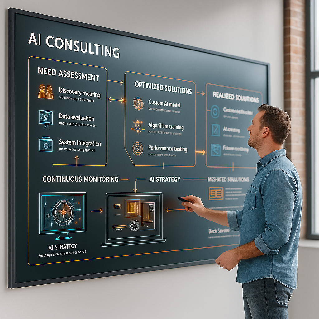 Nuestra consultoría de IA está diseñada para acompañarte en todo el proceso, desde la detección de oportunidades hasta la implementación técnica.